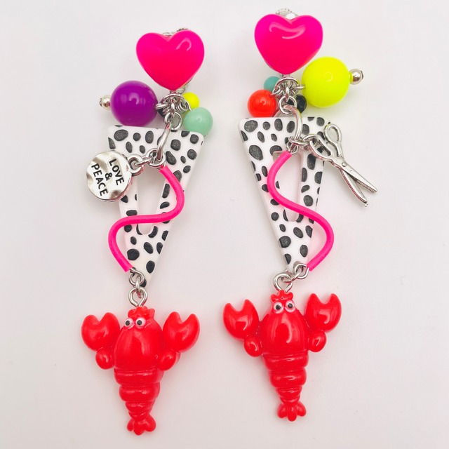 ハートとダルメシアン柄と愛らしいロブスターくん LOVE&PEACEとシザーモチーフ カラフルでごちゃまぜキュートなイヤリングです サイズ/ 全長 約8㎝ 耳たぶより下に揺れる部分 長さ約6.5㎝ ※台紙が一般的な名刺のサイズです カラー/金具 シルバー タイプ/ ねじばね調節タイプイヤリング •メタルパーツ •アクリルパーツ •スワロフスキー社製カラーパール •ジャパンヴィンテージガラスビーズ •チェコガラスビーズ •その他ガラスビーズ •塩化ビニルパーツ など使用