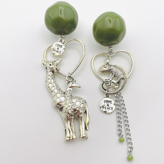 キリンさんの親子とカメレオンくん 左右違いのアシンメトリーデザイン シルバーカラーとカーキグリーンのシンプルな色合わせで いろいろなスタイルに使いやすいデザイン サイズ/ 全長 長さ約9㎝ 耳たぶ下に揺れる部分 長さ約7㎝ ※台紙が一般的な名刺のサイズです カラー/金具 シルバー タイプ/ ねじばね調節タイプイヤリング •メタルチャーム •アクリルパーツ •ガラスビーズ など使用