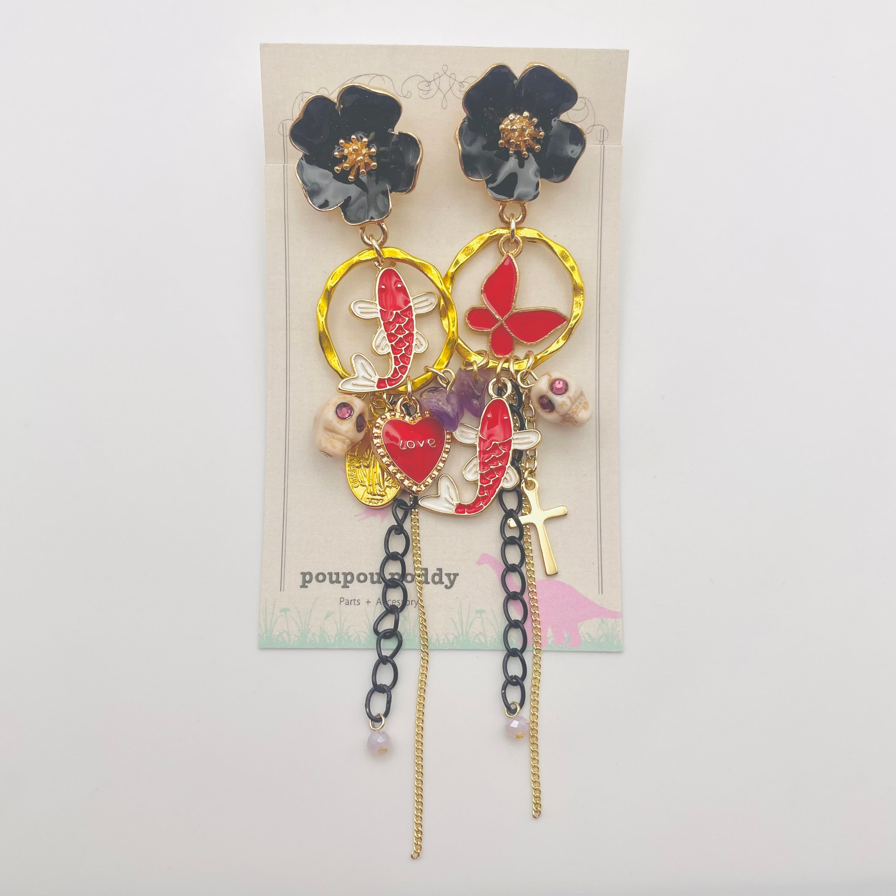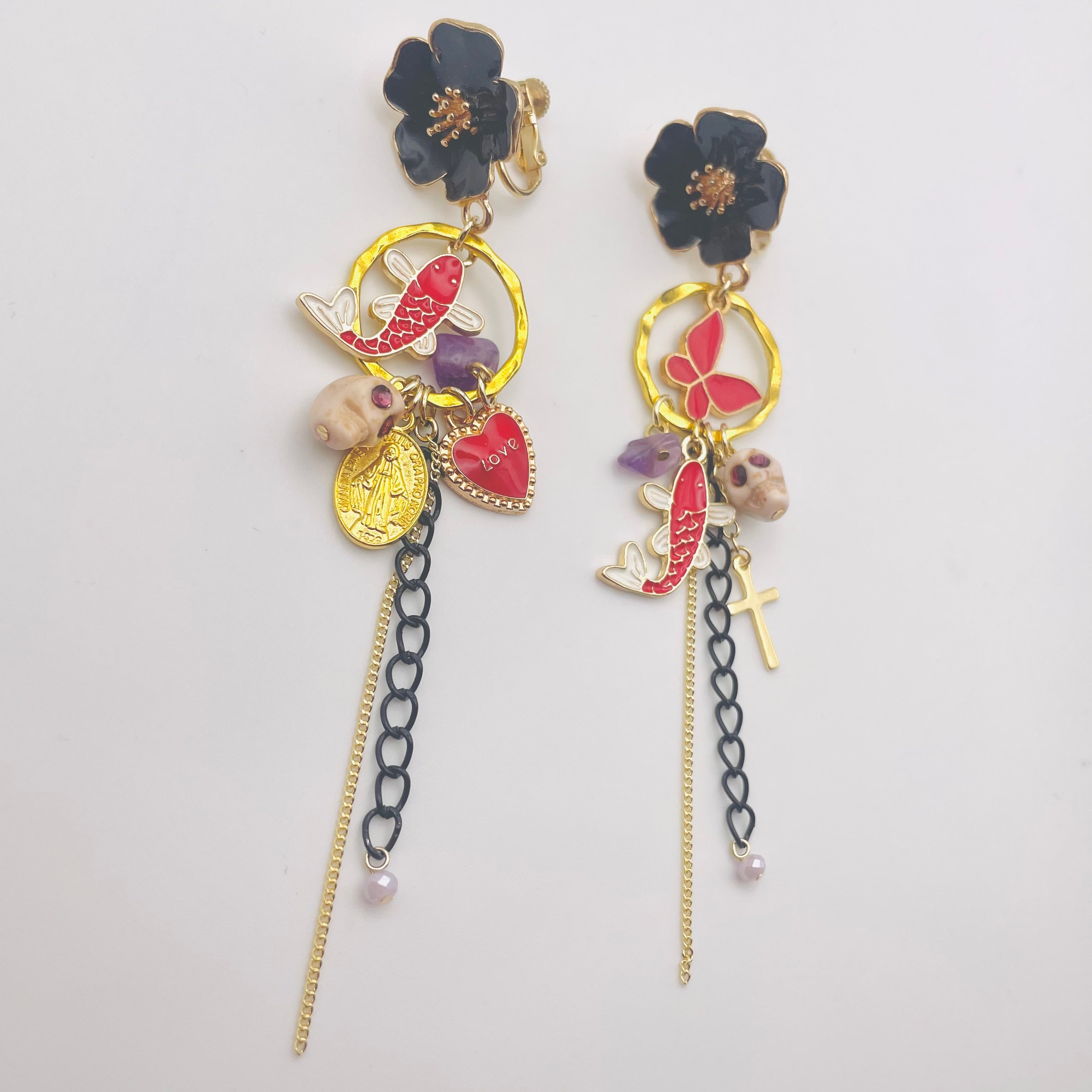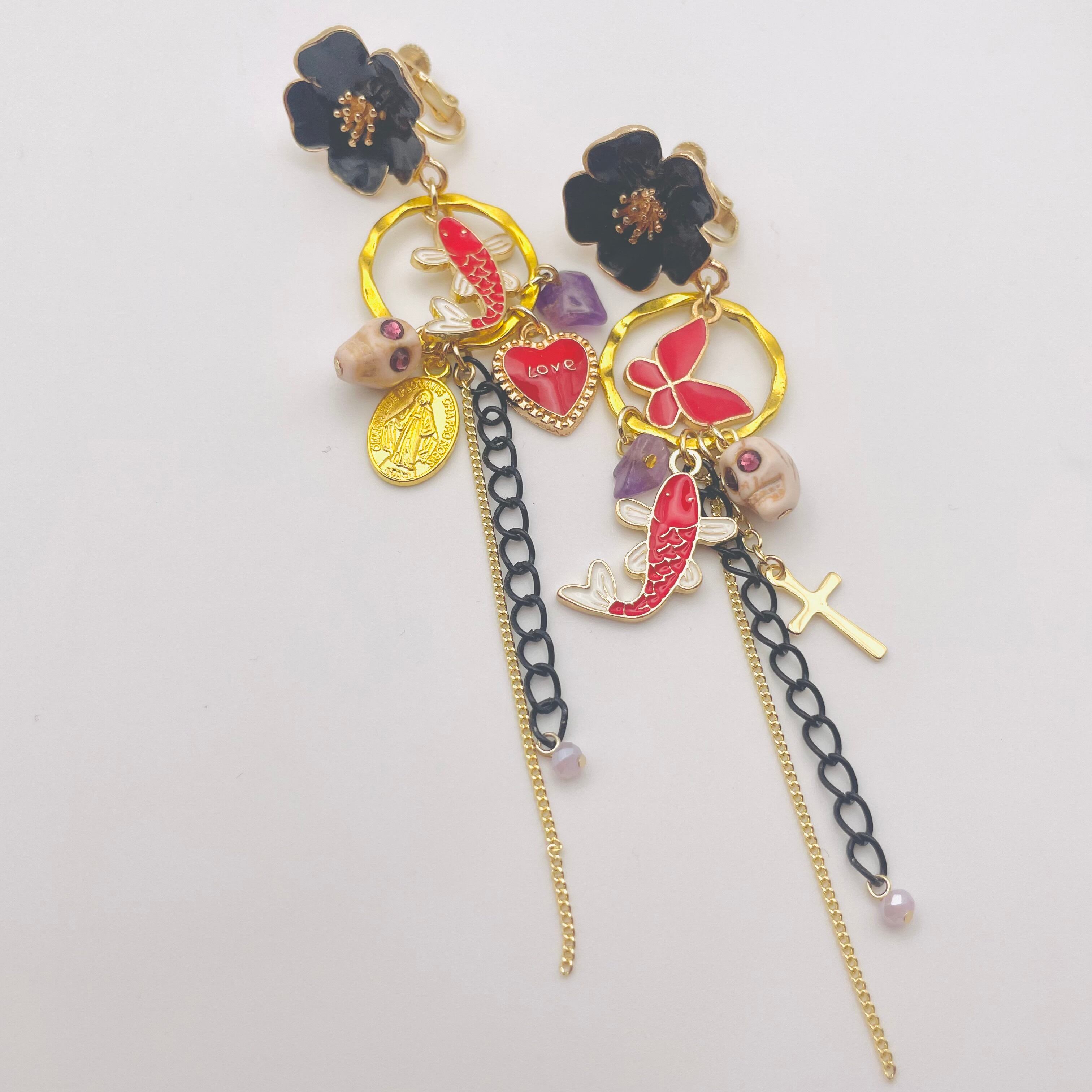 鯉と髑髏、マリア様メダイやクロス、ハートや蝶々に黒いお花など