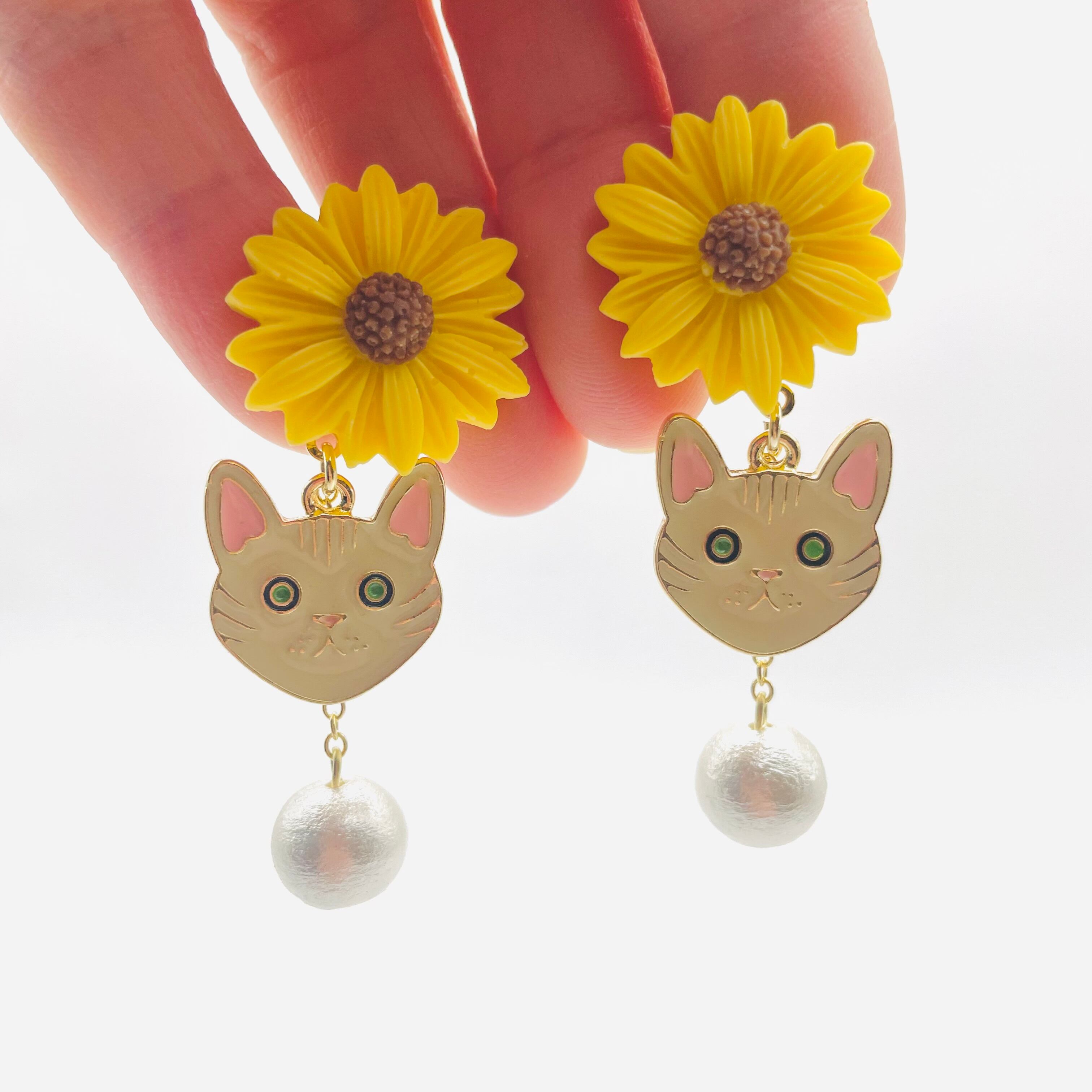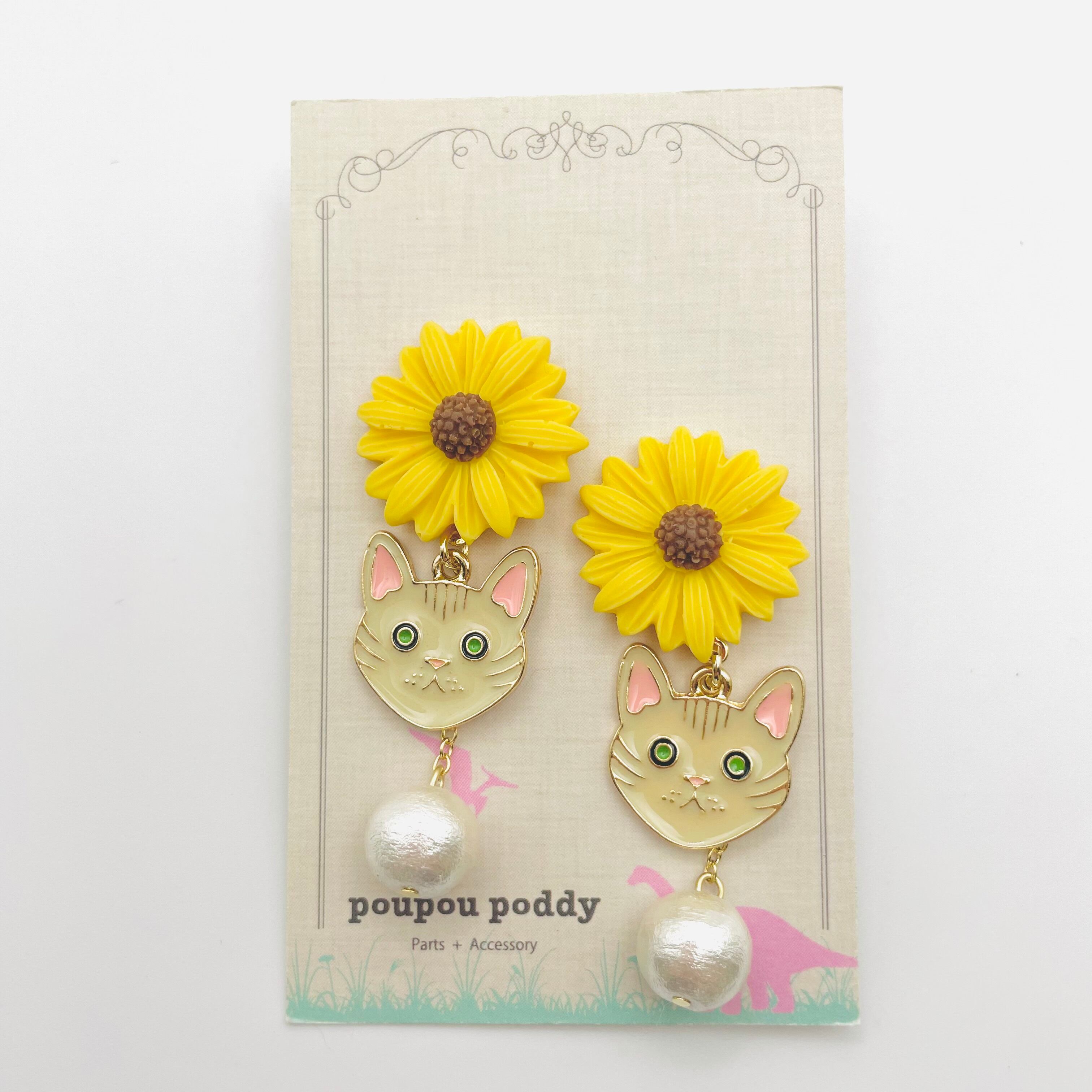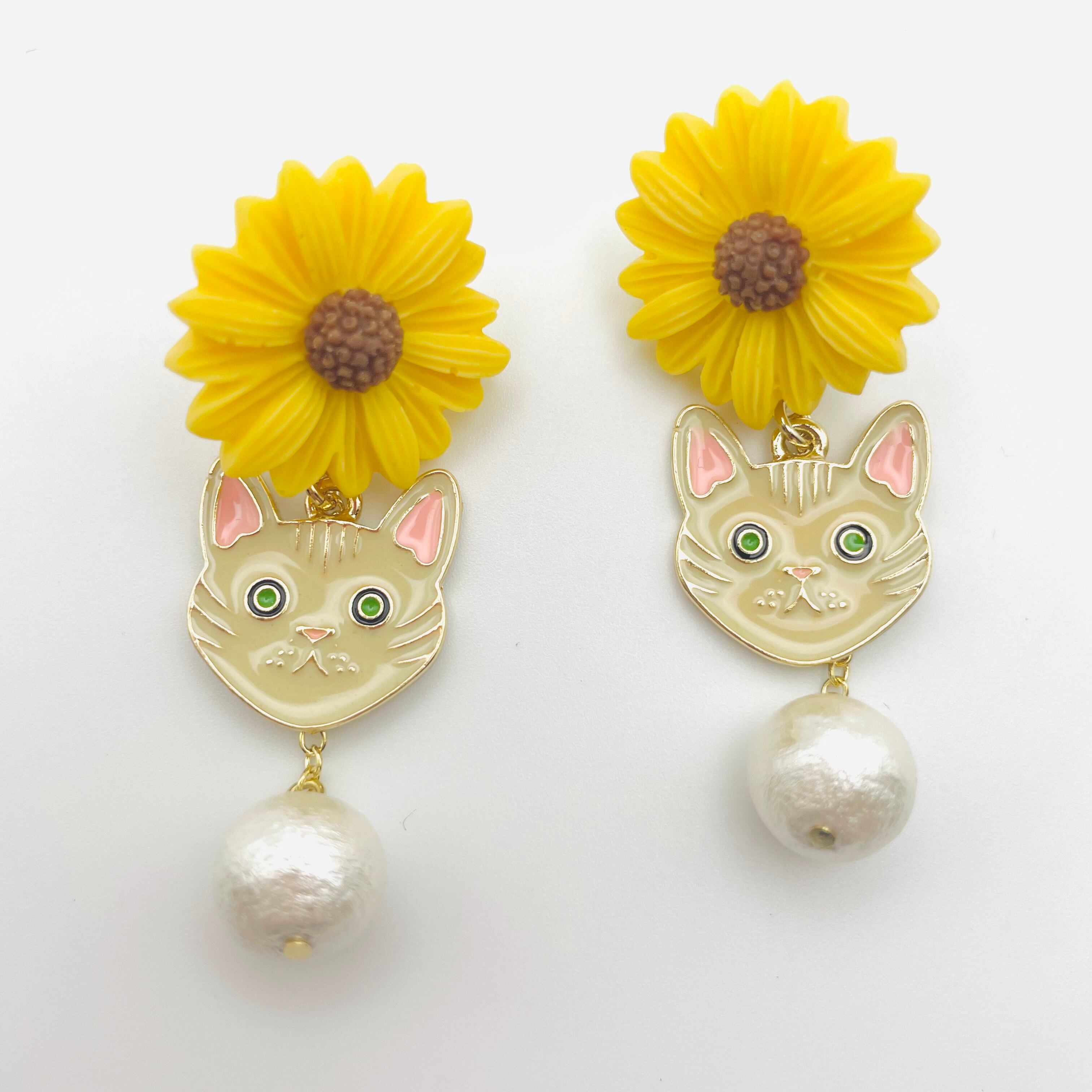 イエローのマーガレットに白猫ちゃんが揺れるピアス