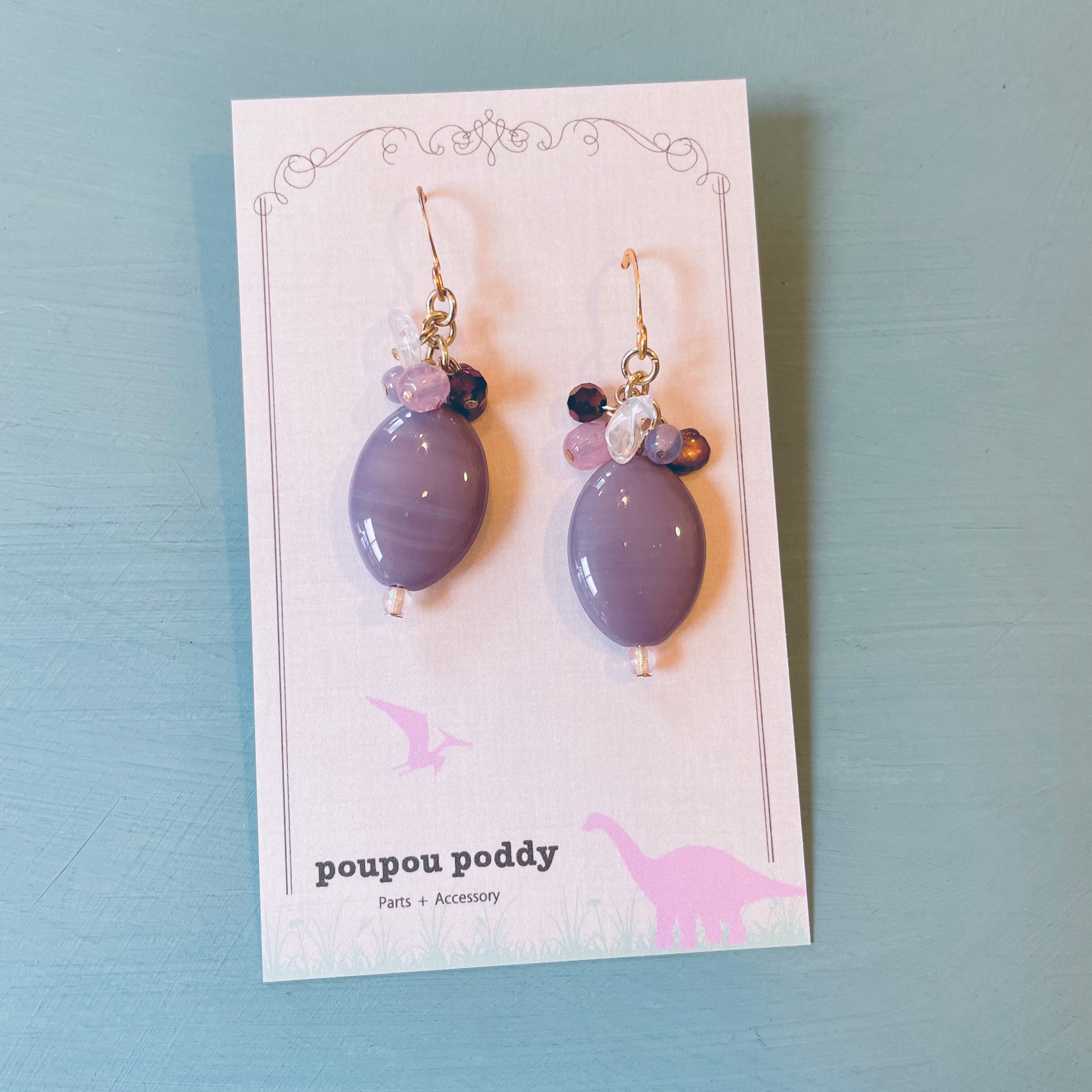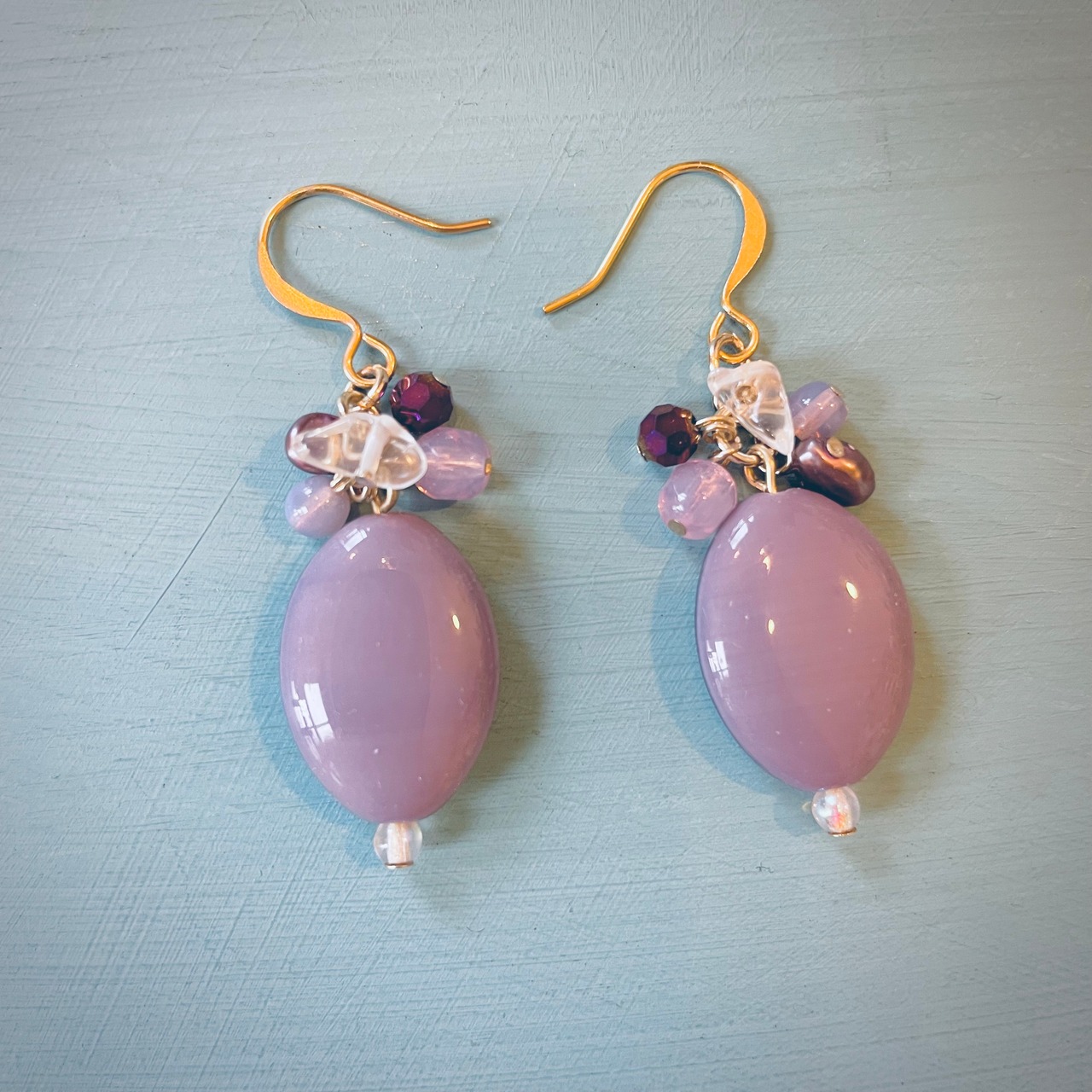 マットなミルキーラベンダーのチェコガラスビーズに小粒の天然石やガラスビーズなどをプラス