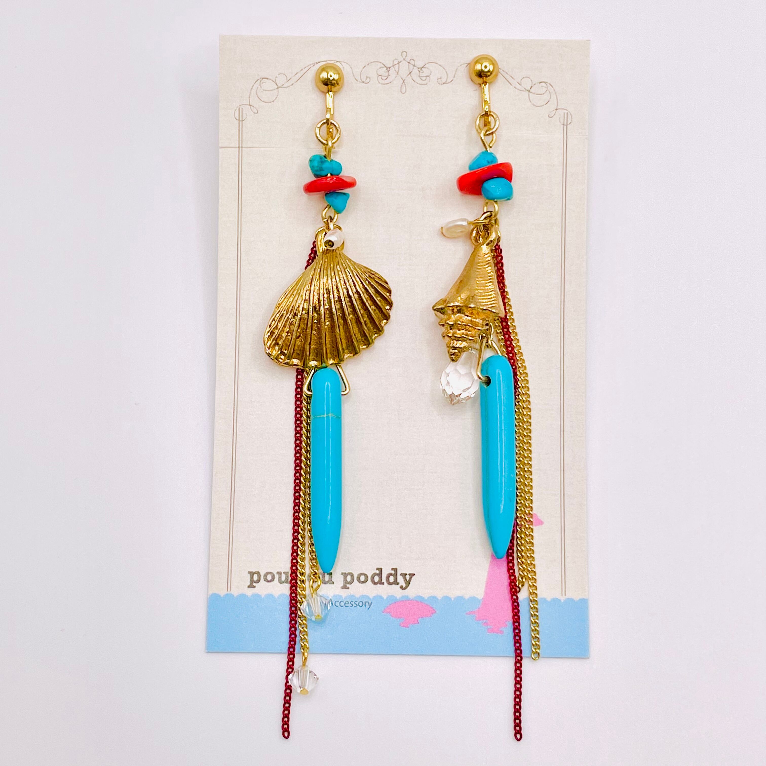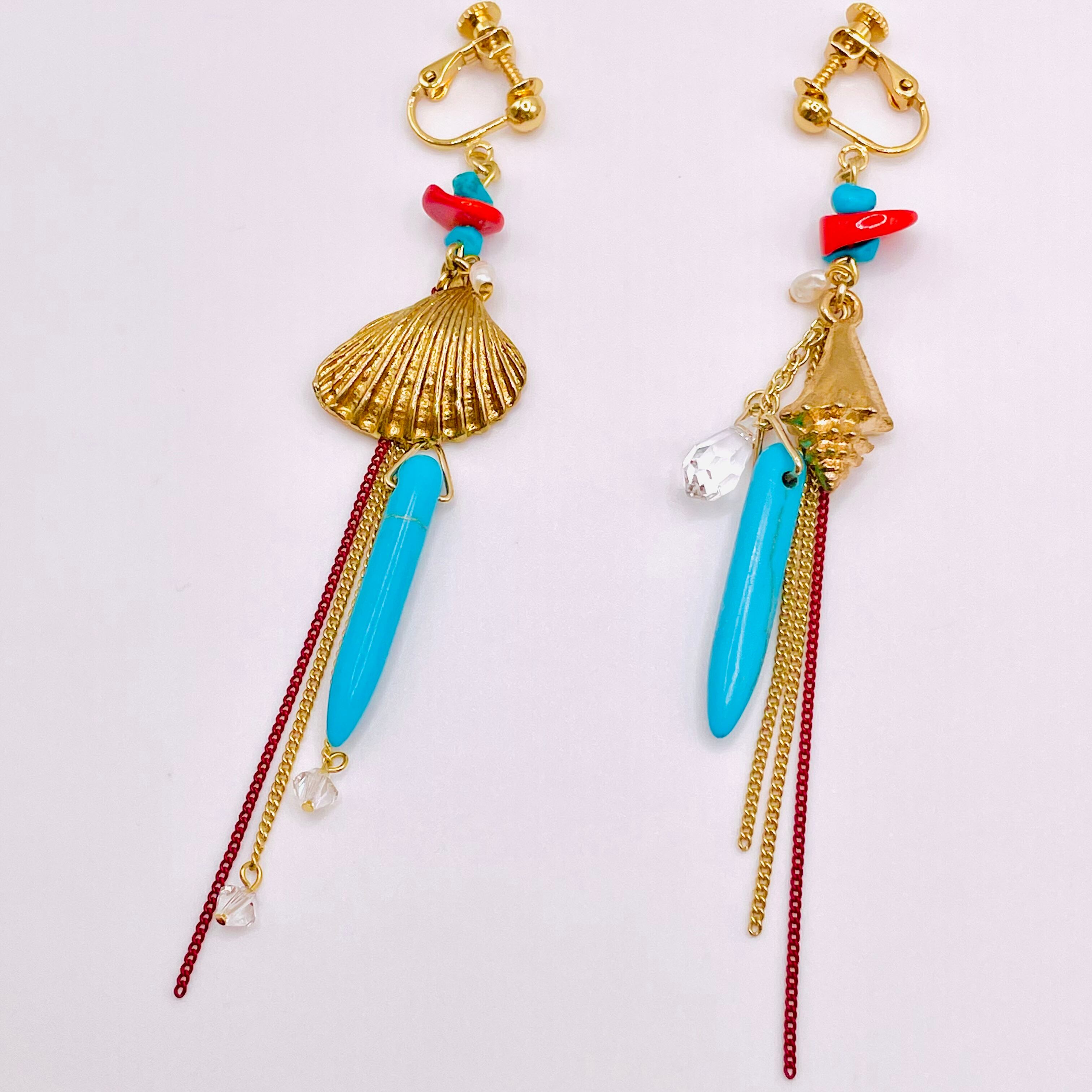 珊瑚の赤とターコイズのブルーが鮮やかなイヤリング