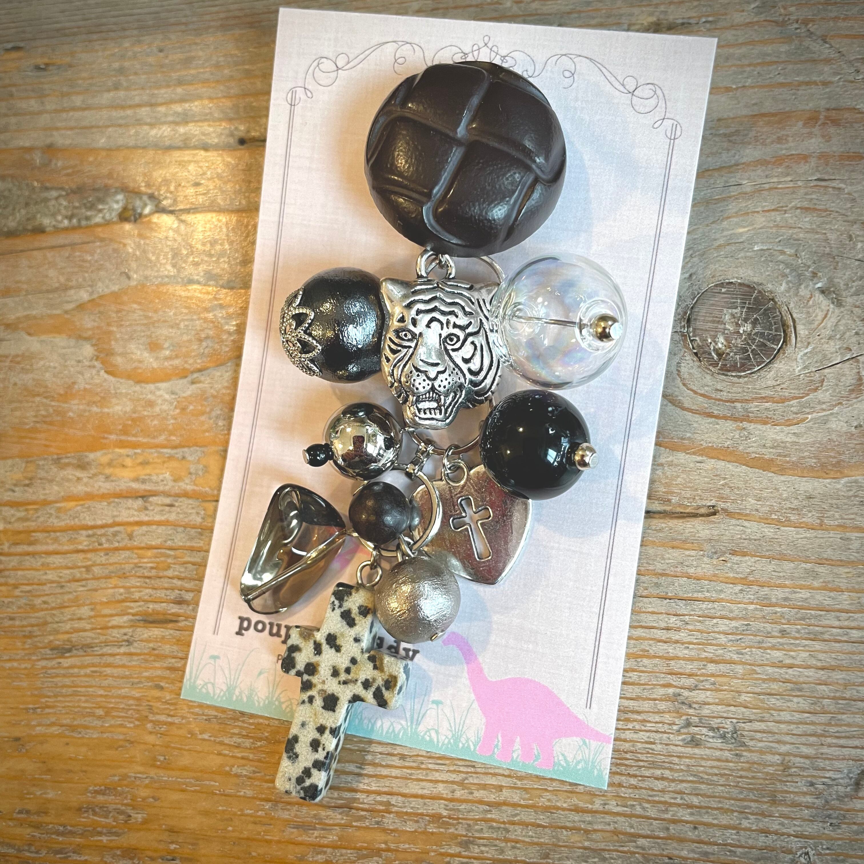 いろいろなチャームやビーズをたわわにゴロゴロと繋いだボリューミーな片耳用のピアスです