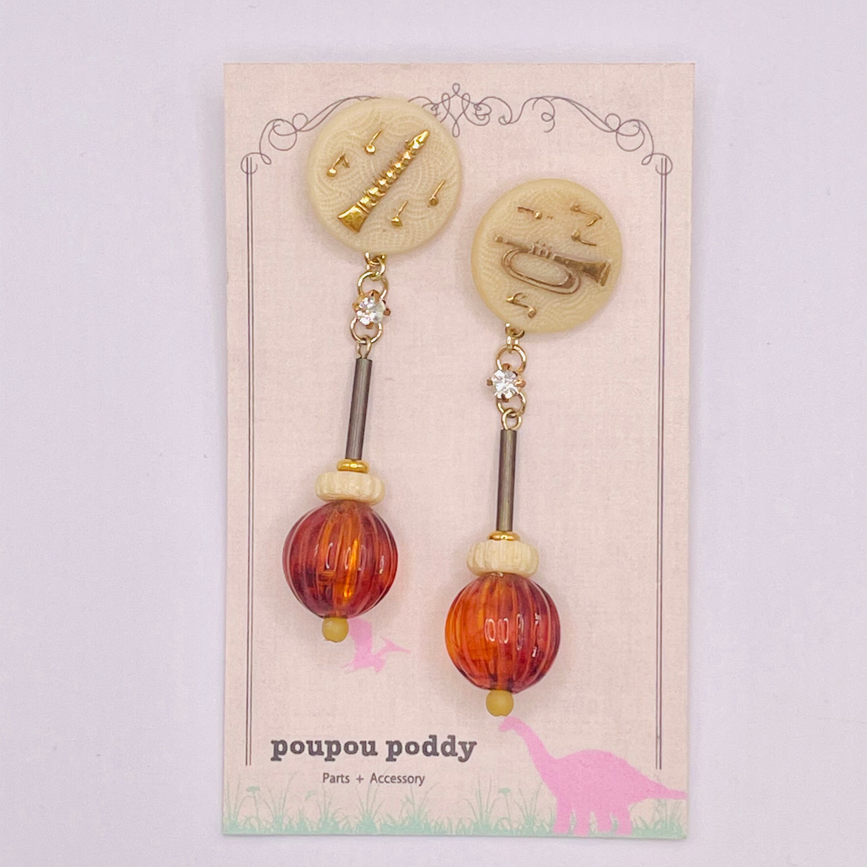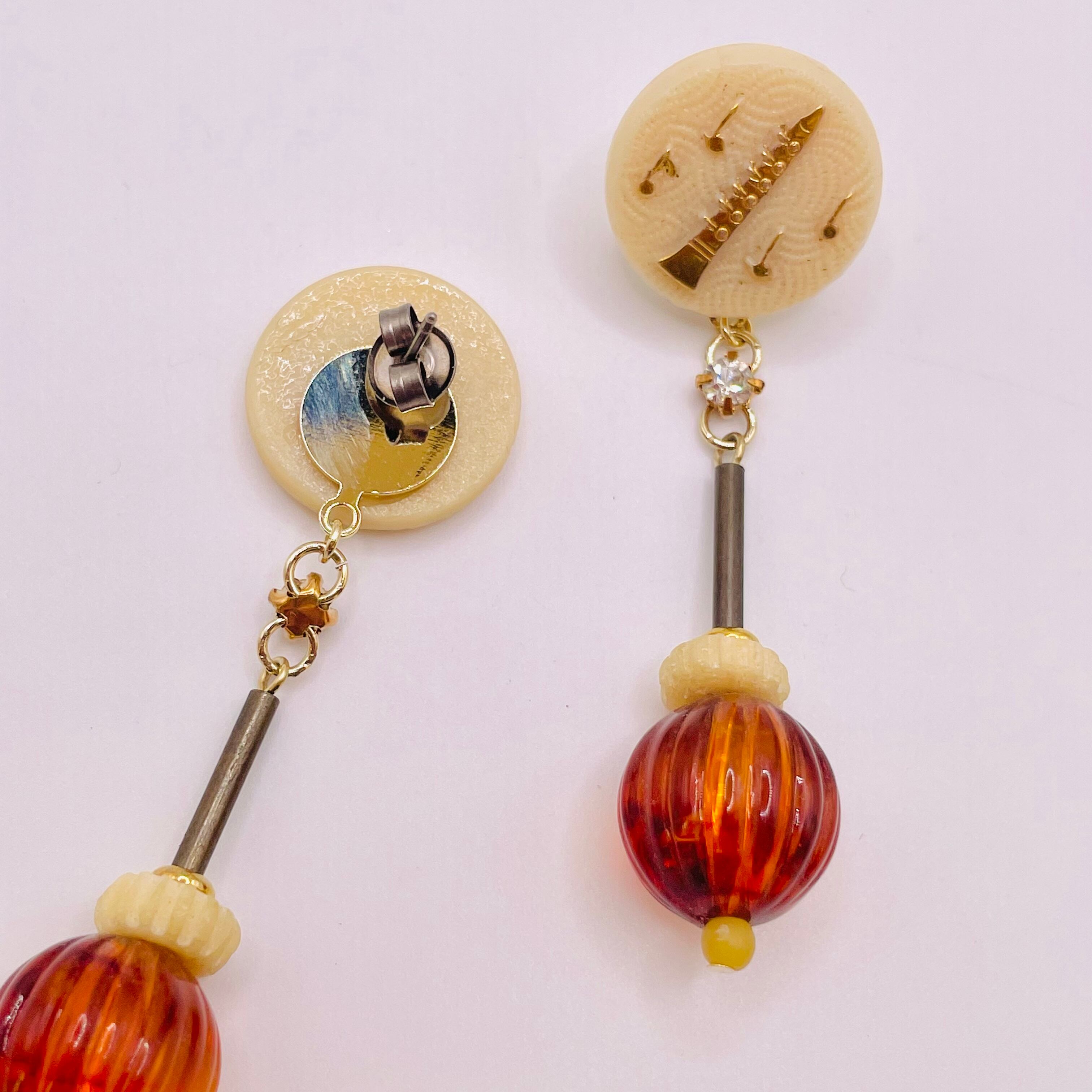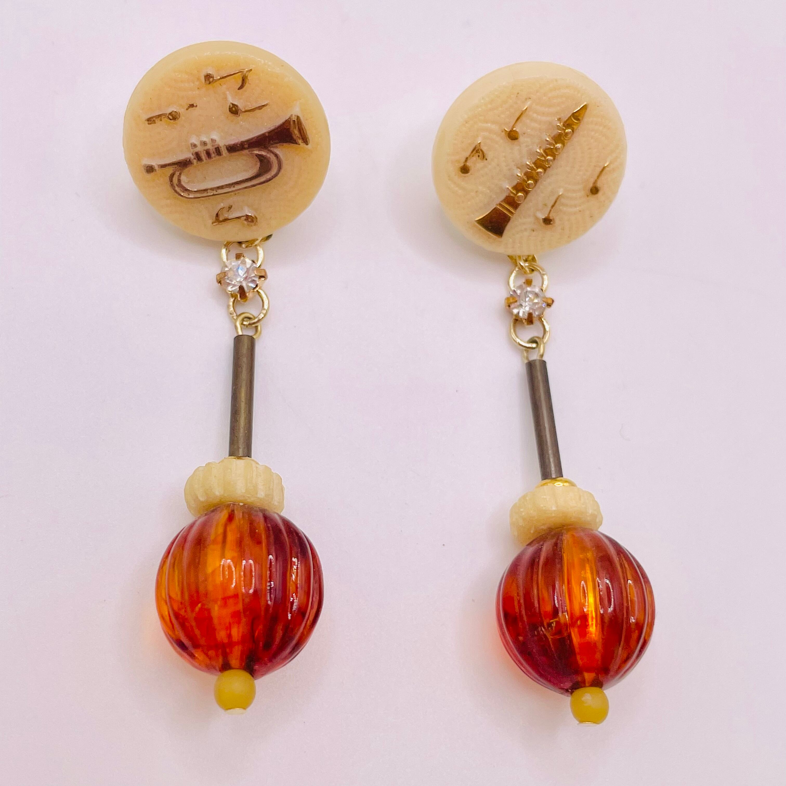 珍しい楽器モチーフのヴィンテージガラスパーツを使ったユニークで楽しいピアスです