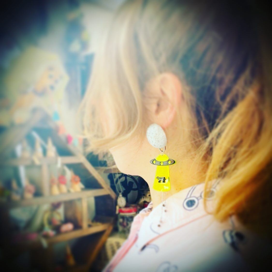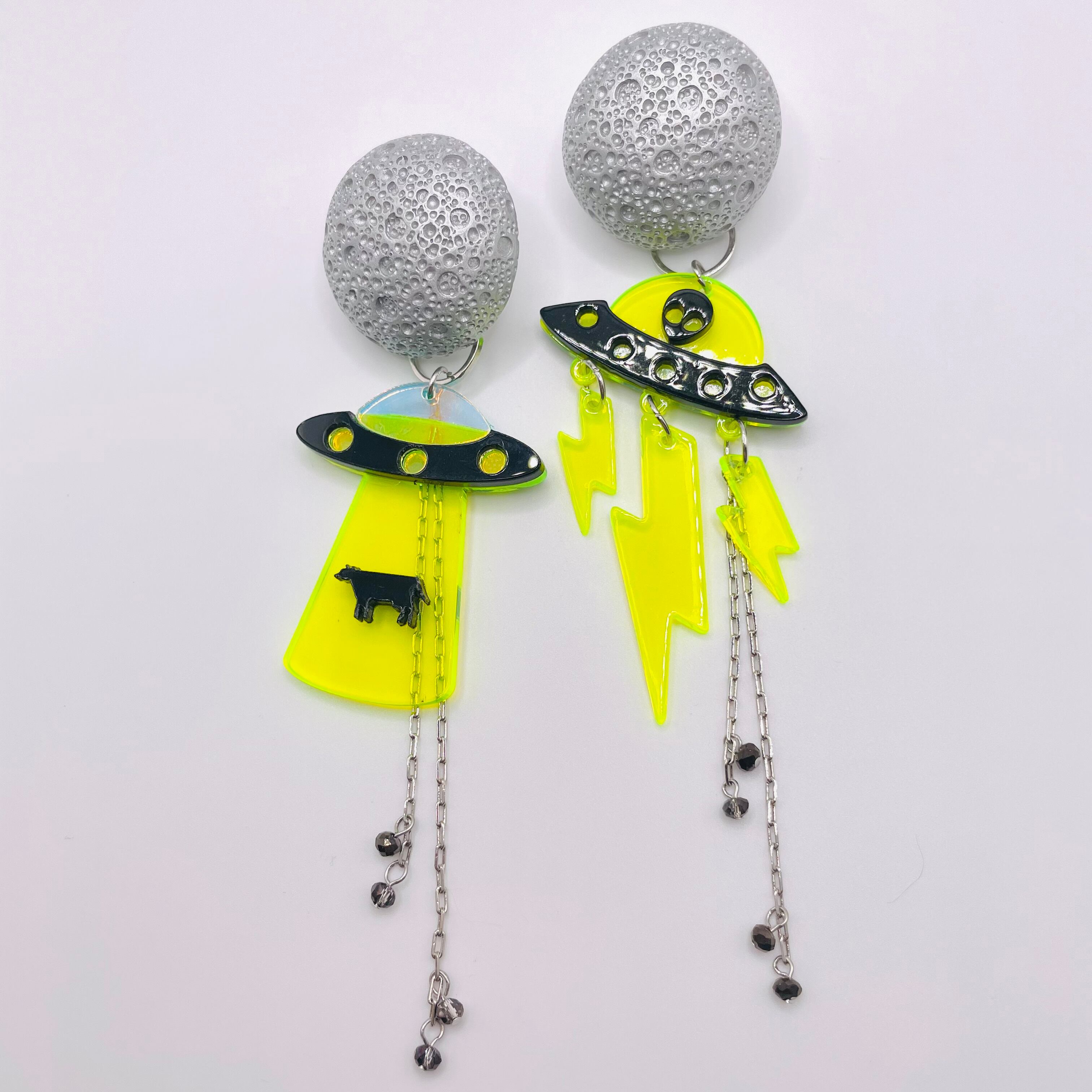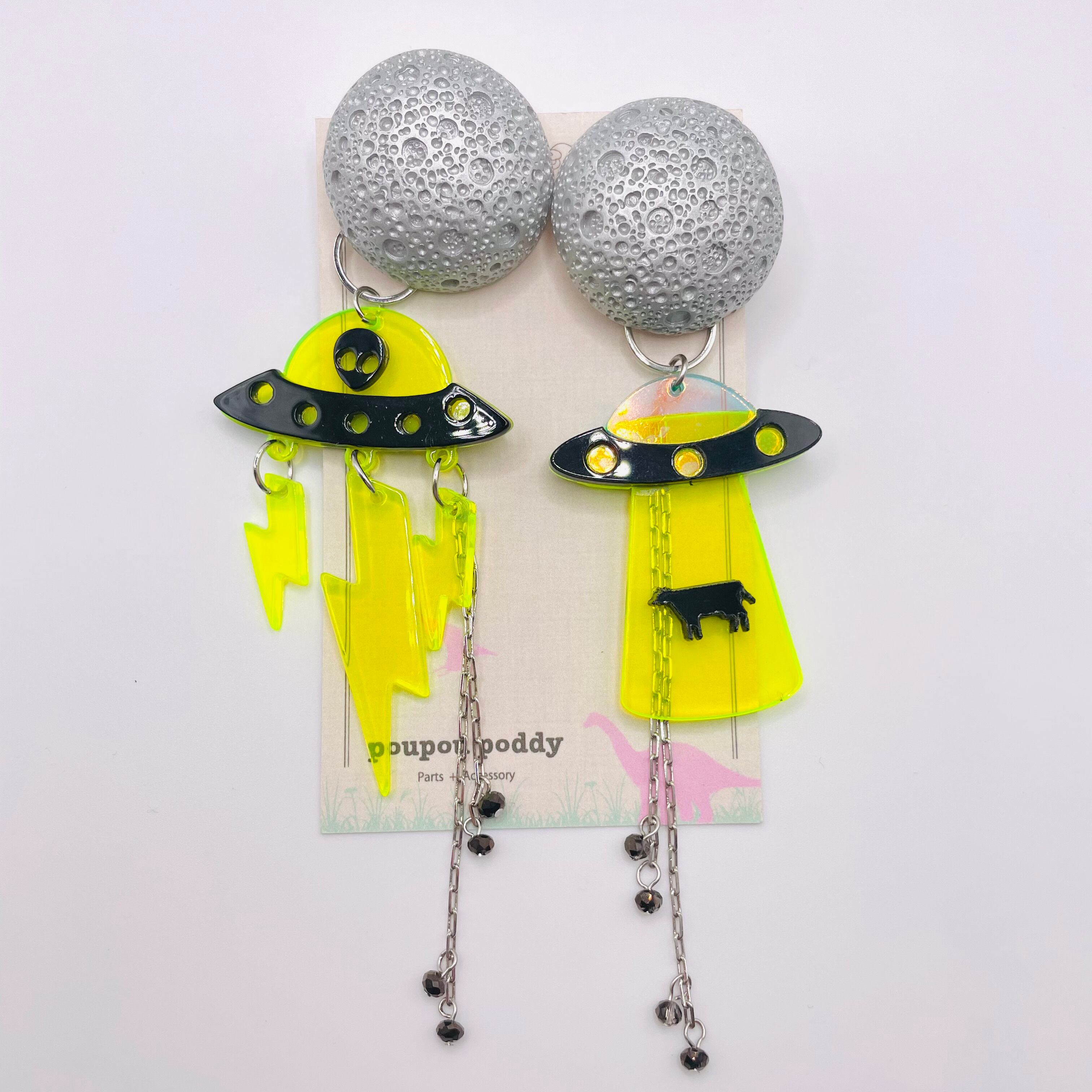大きなシルバーの月面にネオンカラーのUFOという組み合わせがインパクト大なピアスです