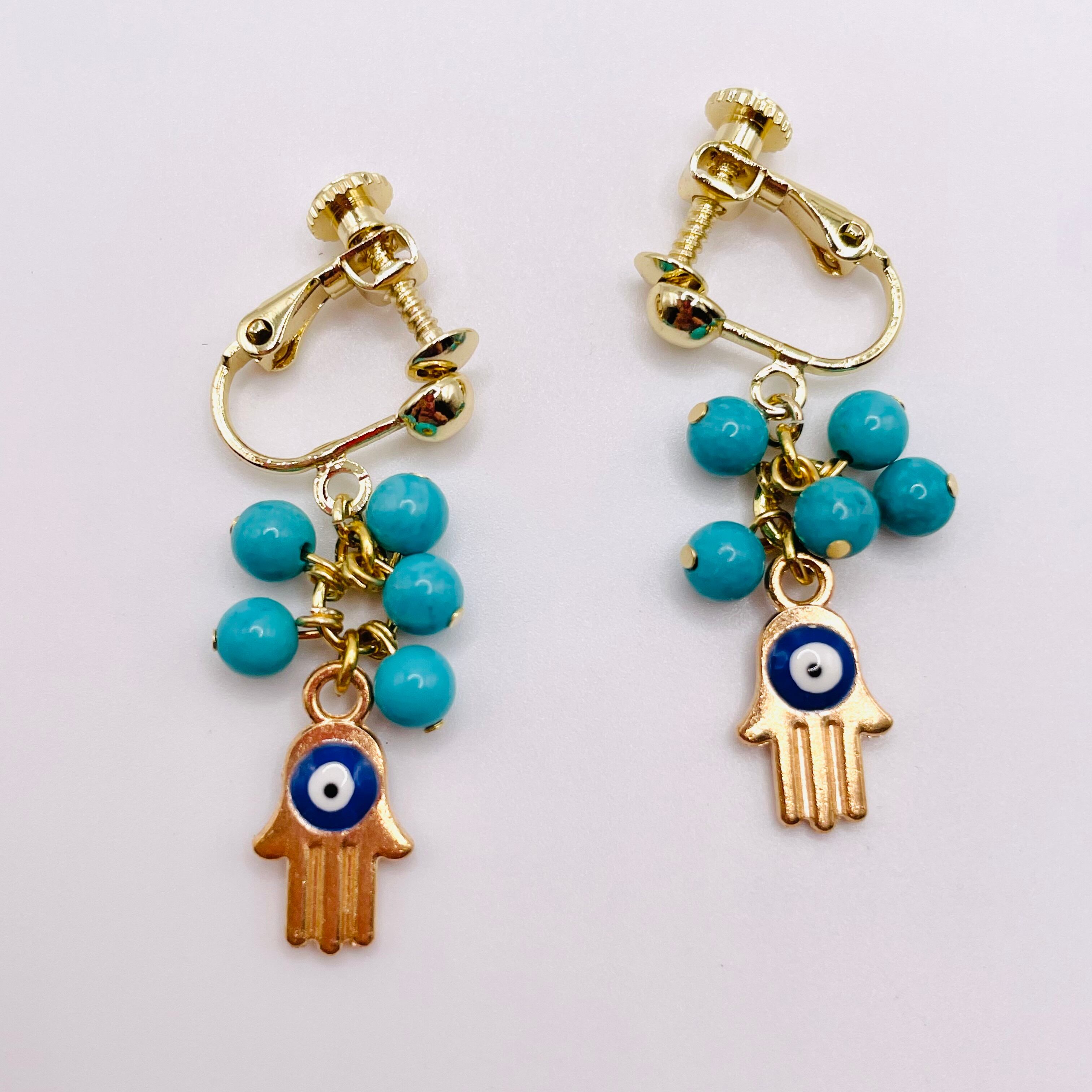 小さめでシンプルなデザインですが、ブルーのひとつ目がインパクト大で、じわじわと愛着の湧くイヤリングです